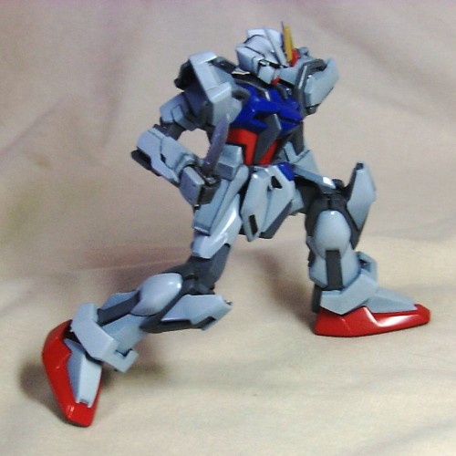 お約束のディテールアップです。足首や肘のオプションジョイント、ライフルの銃口の下など合わせ目消しが面倒な部分のモールドをコトブキヤのプラユニットに取り替え、エールストライカーの翼や頭部アンテナをシャープにし、腰アーマーのエッジも立てました。あと、エールストライカーの胸部側のフィンモールドもデザインナイフで溝を掘り一枚一枚を別にしました。(これはやりすぎてパーツを貫通しちゃいましたが…。)